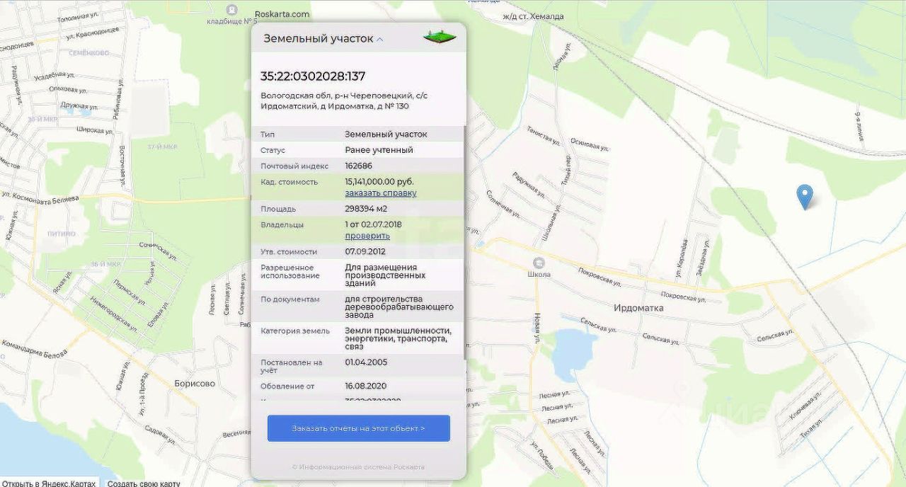 Логистика: - Удобные логистические пути (близость ж/д, до ул.Олимпийской в г.Череповце - около 7км) - помогут построить эффективный бизнес. - Близость к населённому пункту, поможет решить вопрос с квалифицированной рабочей силой Виды разрешённого использования: - Размещение/строительство производственных зданий - Строительство деревообрабатывающего производства - Лёгкая промышленность - Фармацевтическая промышленность - Склады и складские площадки - Хранение автотранспорта