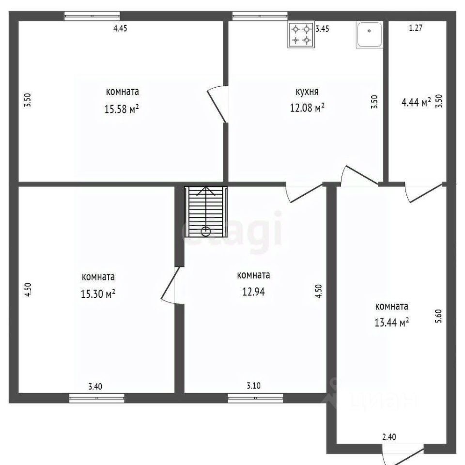 Планировка включает первый этаж с кухней, тремя жилыми комнатами и помещением, подготовленным под санузел.