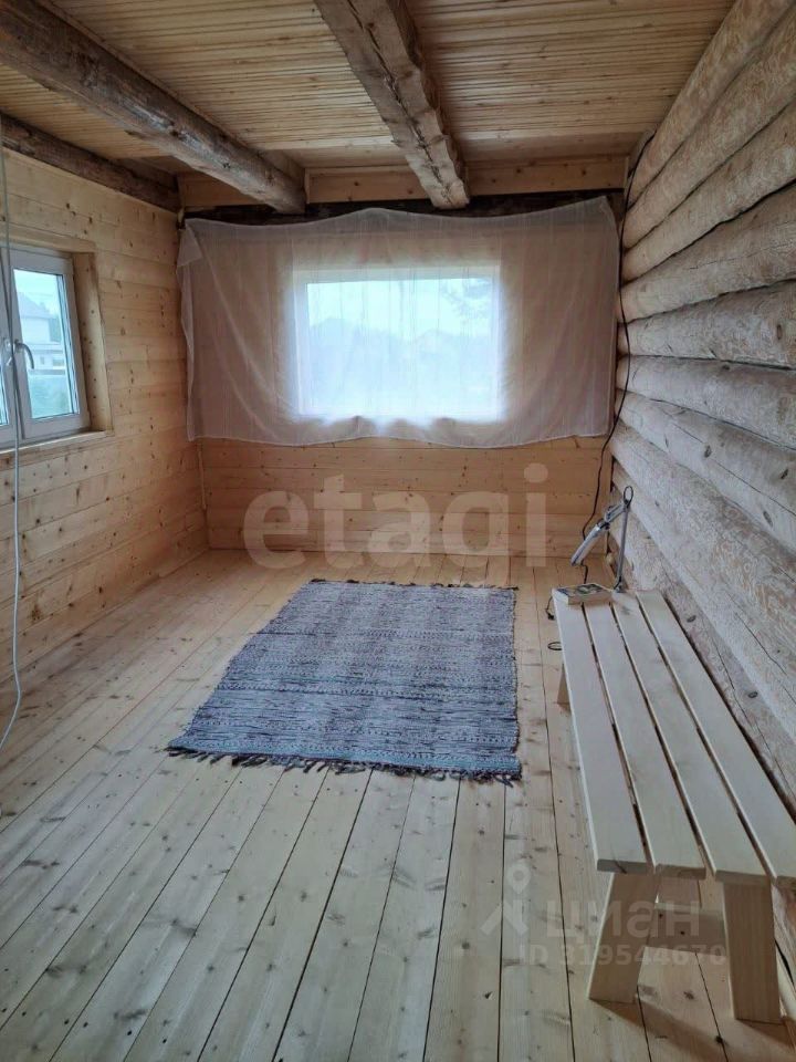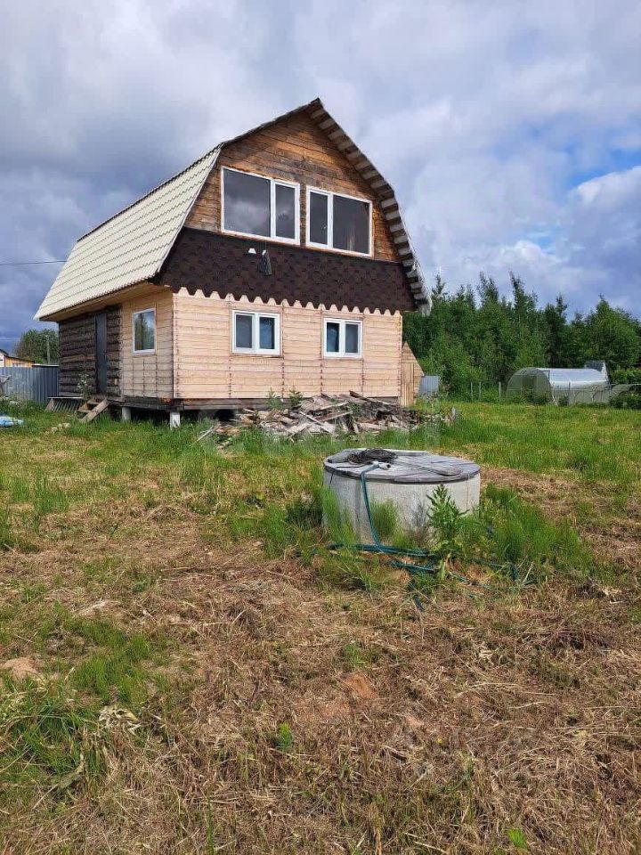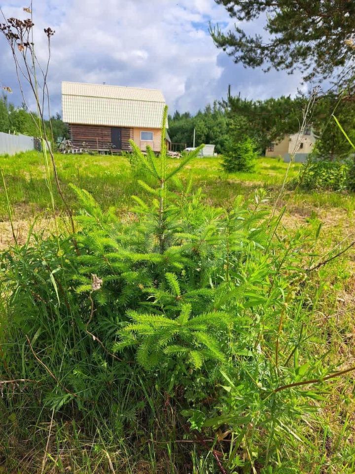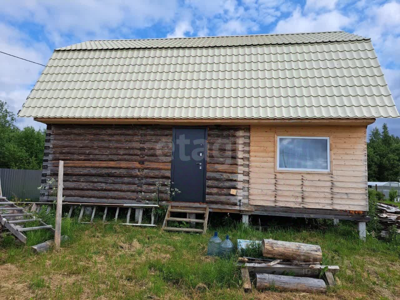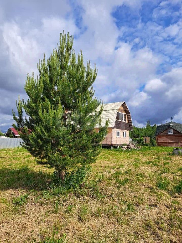 Территория участка благоустроена: здесь высажены ели, сосны и клен, создающие естественную зеленую зону и защиту от ветра. Основной объект — двухэтажный дом из цельного цилиндрованного бревна, установленного на 20 сваях, что гарантирует устойчивость конструкции и долговечность.