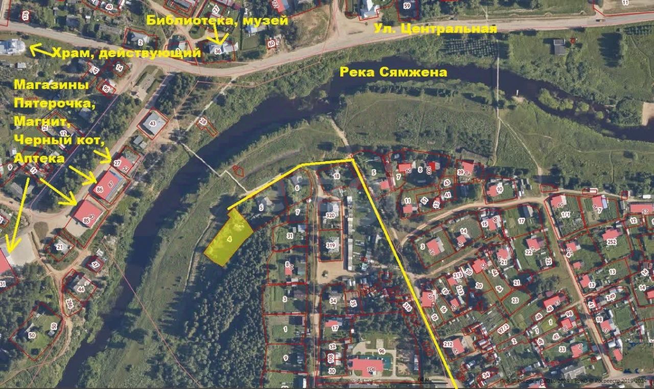 Дом выгодно расположен рядом с центральной частью поселка, а также граничит с рекой Сямжена и красивым лесным массивом, что делает его особенно привлекательным для любителей природы. Участок ровной прямоугольной формы площадью 20 соток окружен высокими деревьями, создавая естественный зеленый забор, который дарует уединение и комфорт.