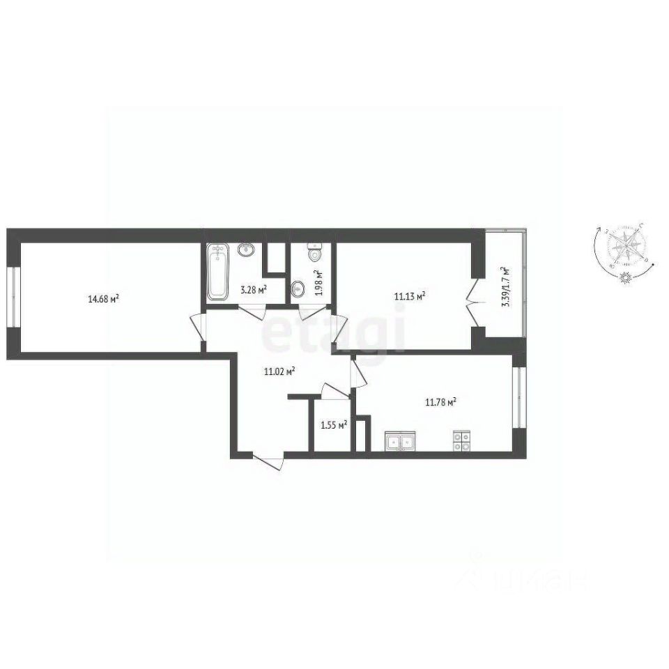Общая площадь квартиры составляет 55,4 кв. м., без учета балкона. кухня - 11,76 кв. м. Комната 11,13 кв.м. и комната 14,68кв.м.