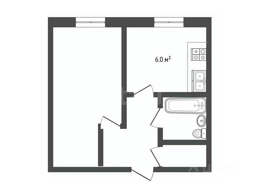 Планировка классическая: комната с ''карманом'', кухня, темная комната, совмещенный санузел.