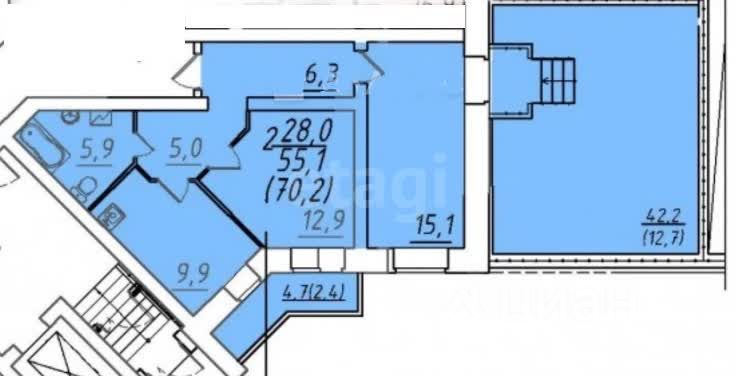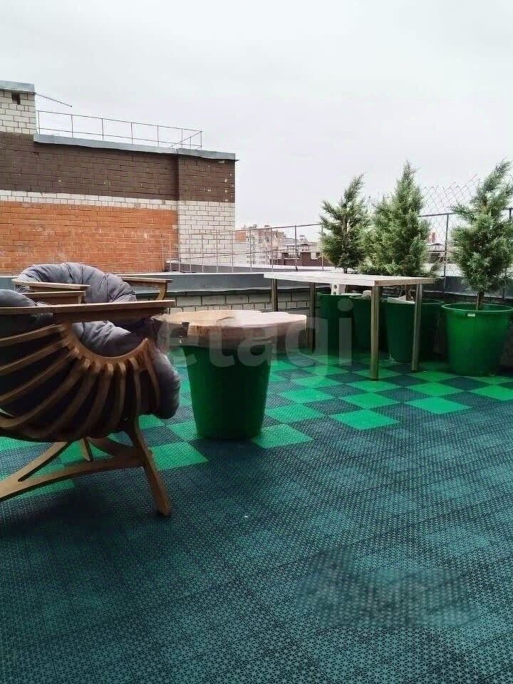 В продаже двухкомнатная квартира в доме с индивидуальной котельной. 12-й этаж, панорамные окна, высокий потолок и прямой выход из квартиры на открытую террасу площадью 51 м². Это не общий балкон, а личное пространство на крыше города — с возможностью обустроить там зону отдыха, поставить кресла, цветы, уличное освещение. Красивый вид и тишина, особенно по вечерам — сторона западная, закаты видно отлично.
