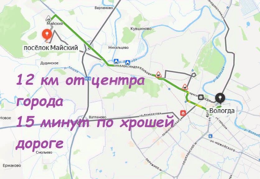 Дом находится в поселке Майский в 15 минутах от центра города Вологды по хорошей дороге.
