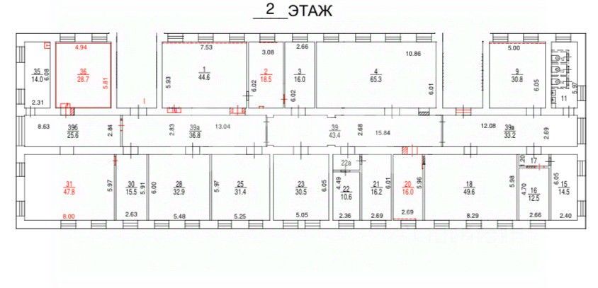 Помещение расположено на 2 этаже. Этаж целиком. 2 мокрые точки. Кабинетная планировка. 18 кабинетов. Две лестницы.