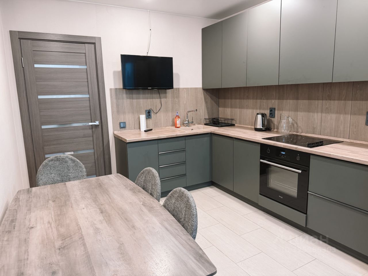 В квартире есть все необходимое для проживания: - большой раскладной диван на 2 полноценных спальных места - вместительный шкаф-купе - комод - кухонный гарнитур с необходимой техникой (электрическая варочная панель, духовой шкаф, холодильник, электрический чайник) - большой обеденный стол - телевизор (на кухне) - стиральная машина