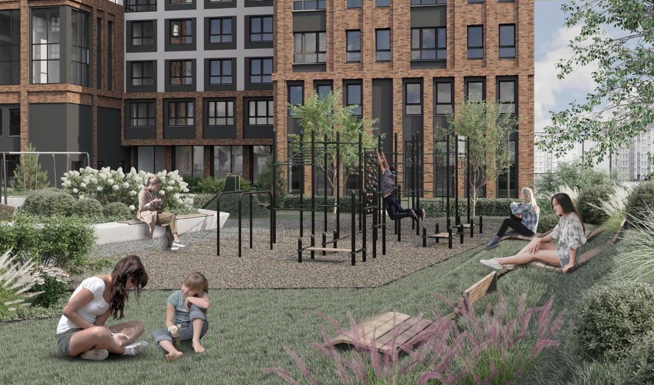 Внутренняя территория полностью закрыта от машин и посторонних людей, что создает комфортные условия для прогулок и отдыха для всех членов семьи в любое время дня и ночи.